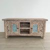 Consola en madera teca reciclada y color blanco envejecido y tono celeste.