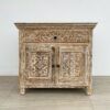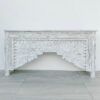 Consola tallada a mano en madera teca, color café envejecido.